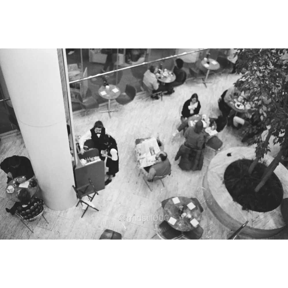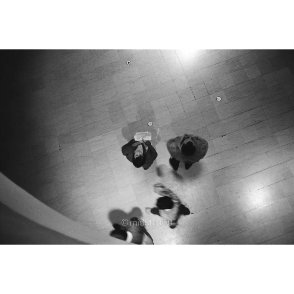 Seen from above, footsteps drift across polished floors like passing thoughts. The city moves, yet each figure seems alone in a private corridor of time. A fleeting geometry of motion and distance.