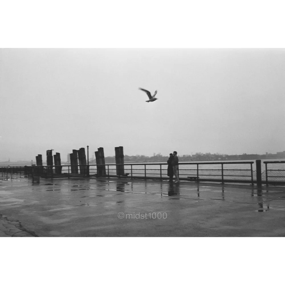 A lone bird crosses the sky above a damp pier, its wings marking a moment soon forgotten by the waking city.