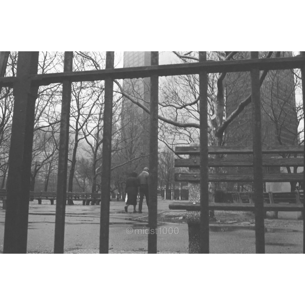 Bare branches press their silence against an iron fence, winter drawing its lines with the language of absence.