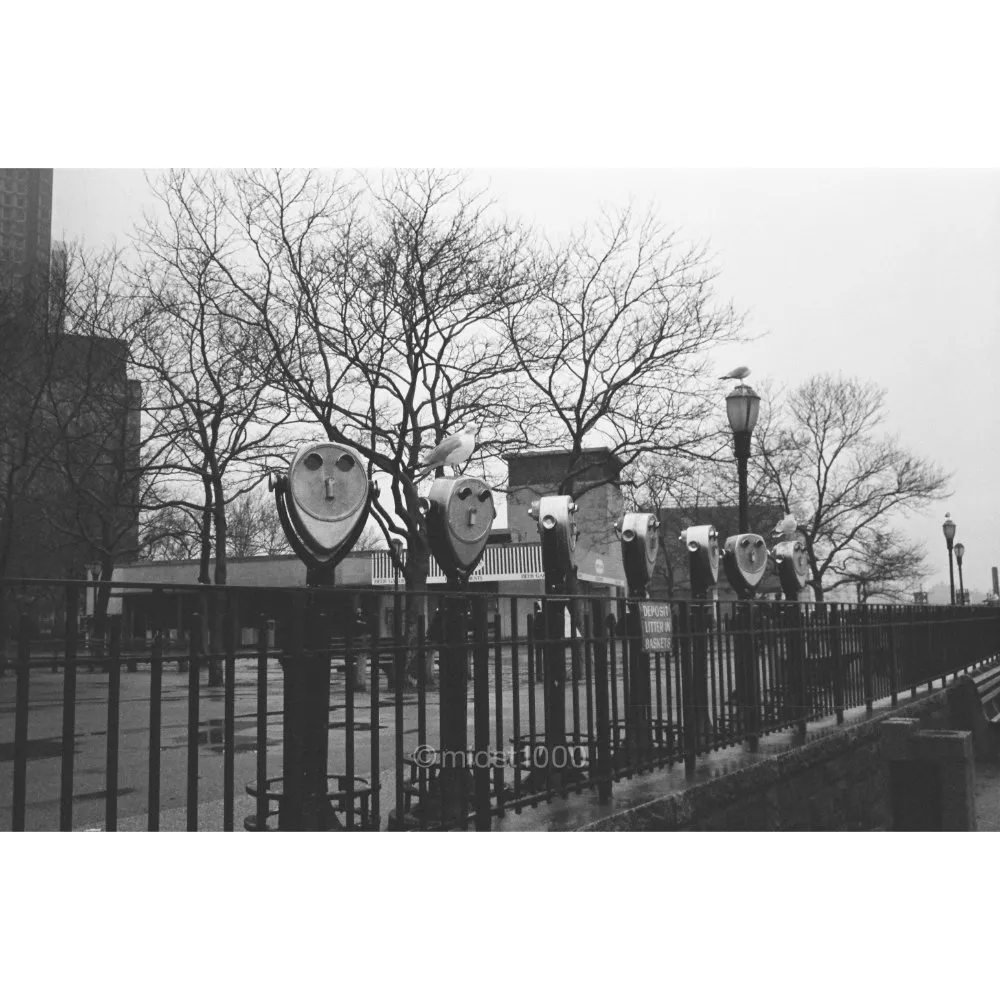 A coin-operated viewer stands quietly in the harbor rain, staring toward a horizon blurred by weather, as if keeping watch for things no longer arriving.