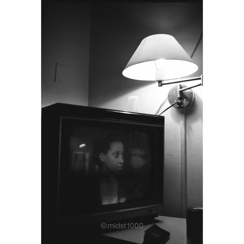 In a dim hotel room, the television flickers to life, revealing a woman's face that seems unaware of the quiet surrounding her. For a moment, her distant expression fills the space, as if the room had borrowed a stranger’s presence.