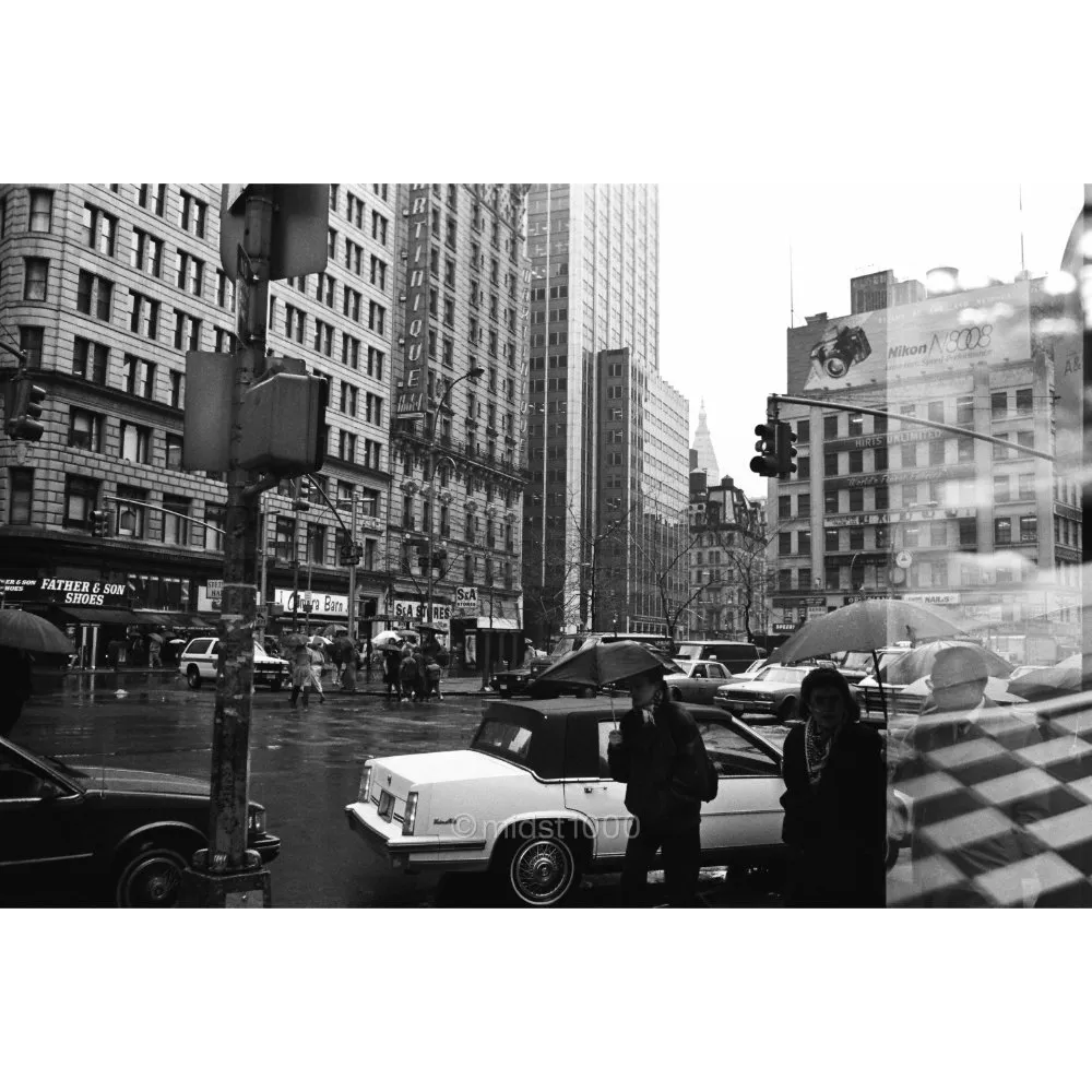 The city reflects back at itself in rain-soaked surfaces, where headlights and umbrellas meet for only a breath of time.